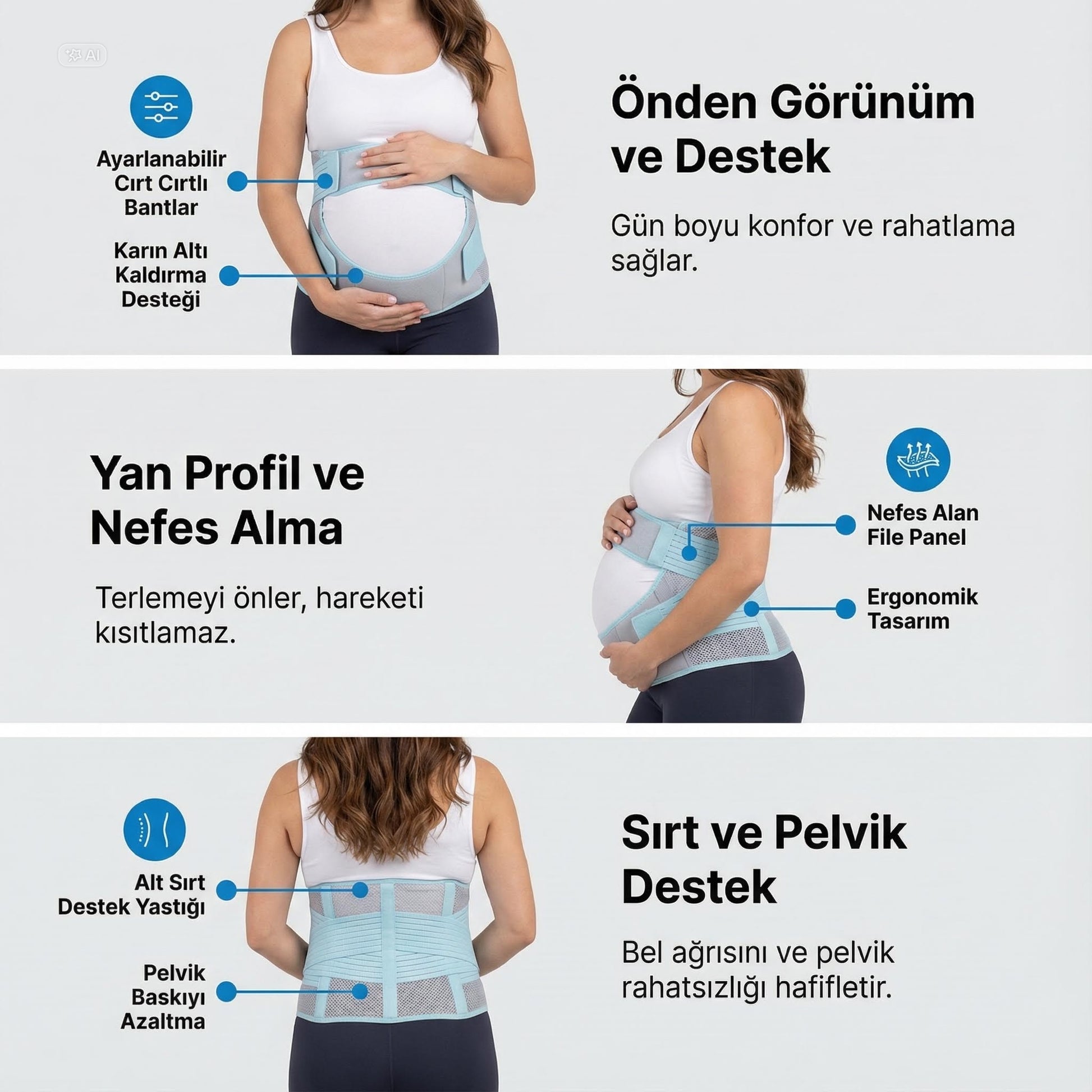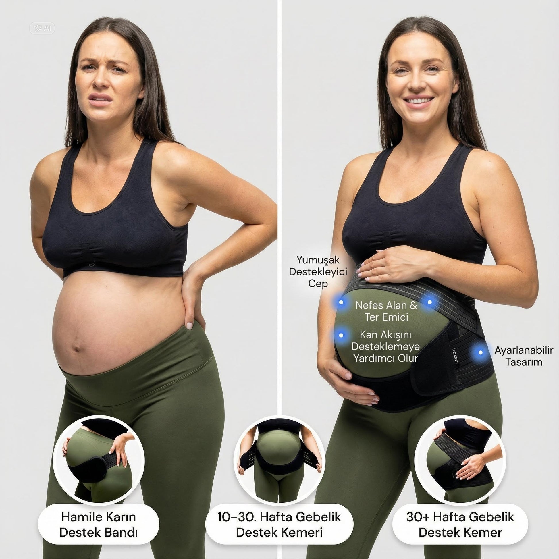Ayarlanabilir yapısı sayesinde hamileliğin farklı dönemlerinde vücudunuza uyum sağlar ve ihtiyacınıza göre destek sunar.